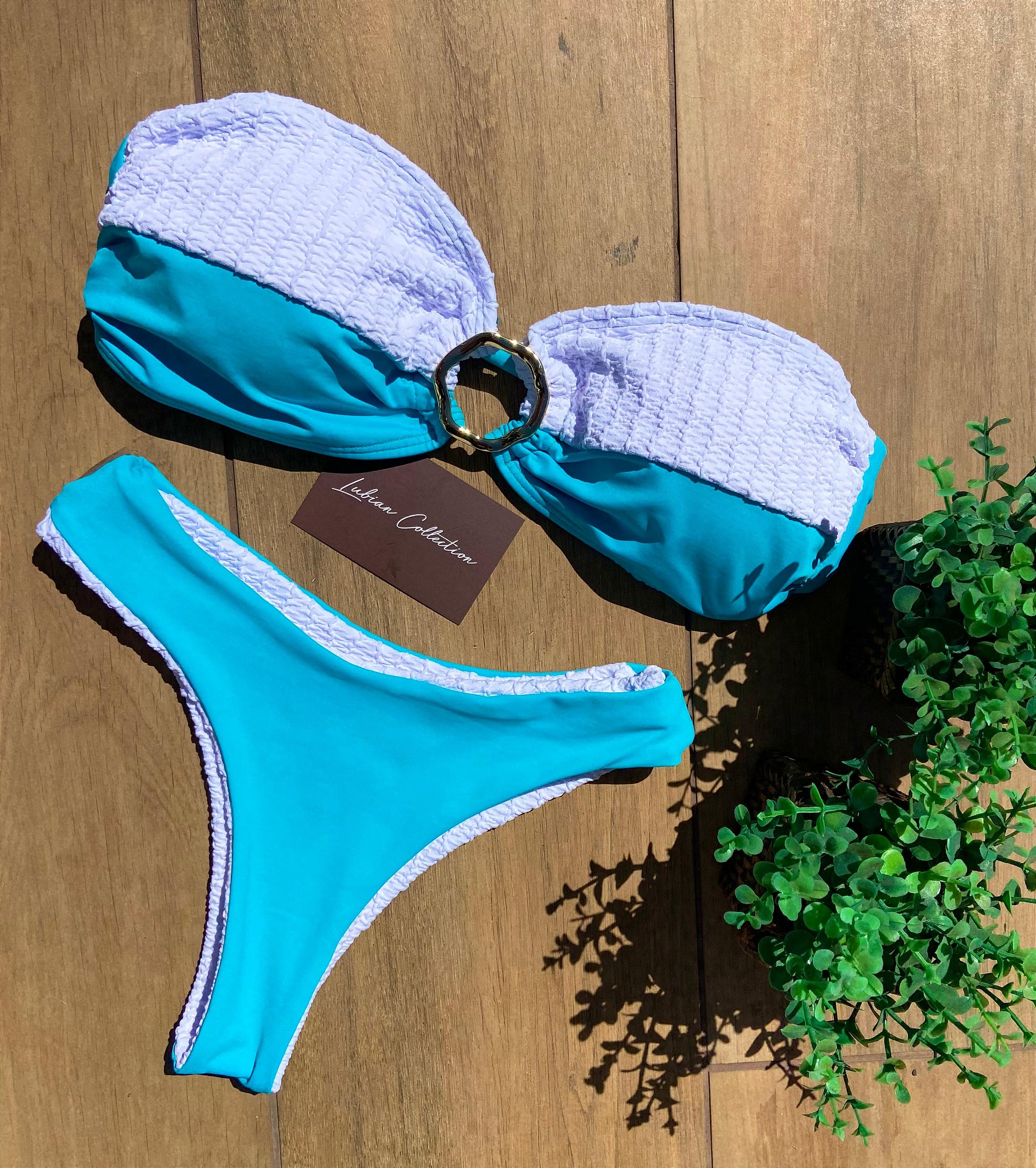 O biquíni tomara que caia com Fivela é elegante, sofisticado e nunca sai de moda. Ele está em alta nas tendências desse verão.